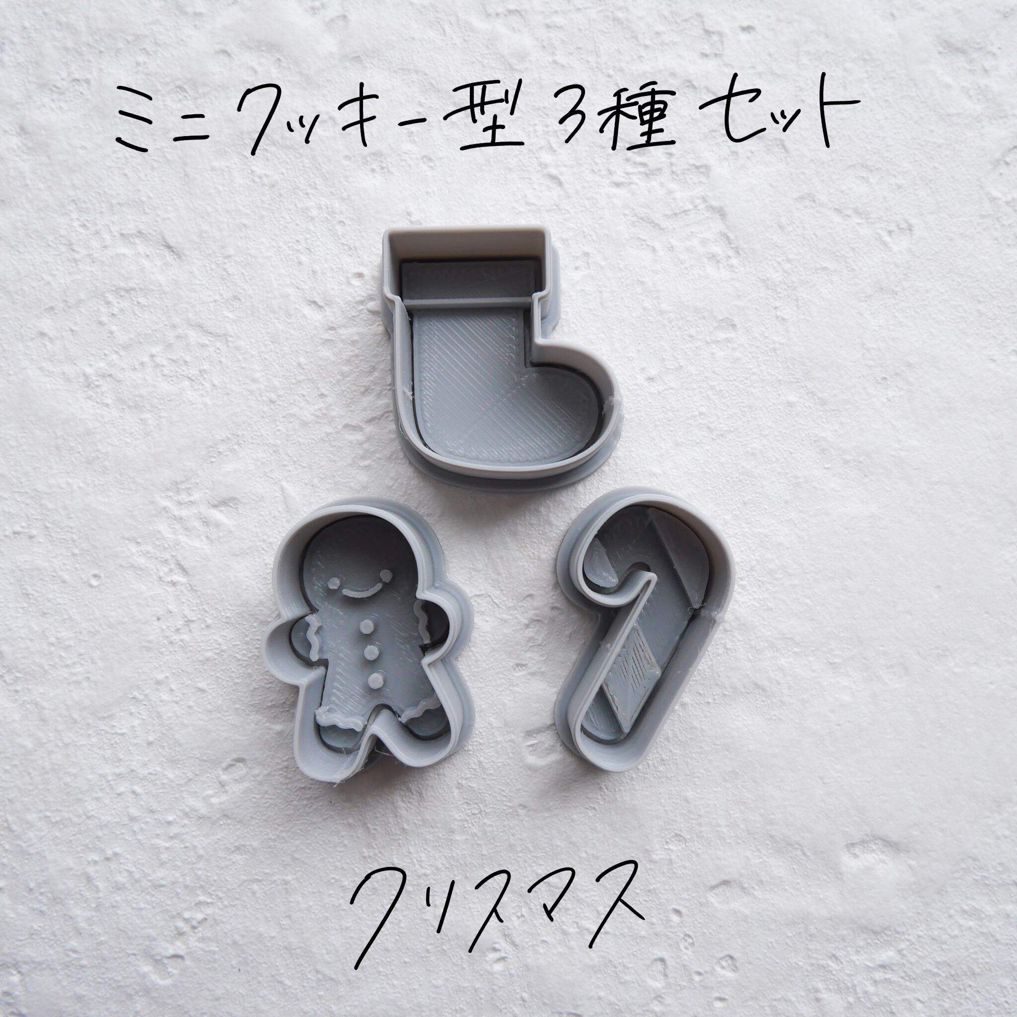 クリスマスシリーズから、ジンジャーブレッドマン、靴下、キャンディの棒、3点がセットになったものです。